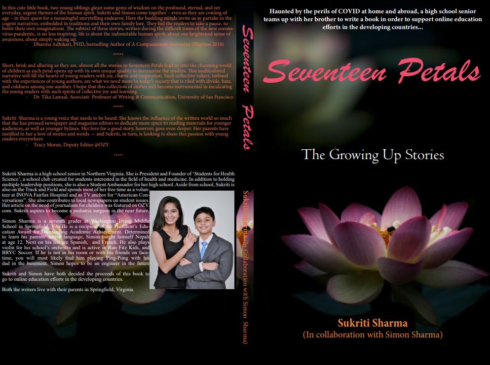 अमेरिका । सारा विश्व कोभिड-१९ को कहरमा नराम्रोसँग जकडिएको परिस्थितिमा नेपाललगायत अन्यत्र स्थानमा रहेका शरणार्थी शिविरहरूस्थित बालबालिकाको स्वास्थ्य एवं शिक्षा सेवाको लागि सहयोग पुर्याउने उद्देश्यले भर्जिनिया निवासी सुकृति शर्माले आफ्नो भाइ साइमनसँग हातेमालो गरी सत्र पुष्प पत्र (सेभेन्टिन पेटल्स) नामक पुस्तक प्रकाशित गरेकी छिन्।