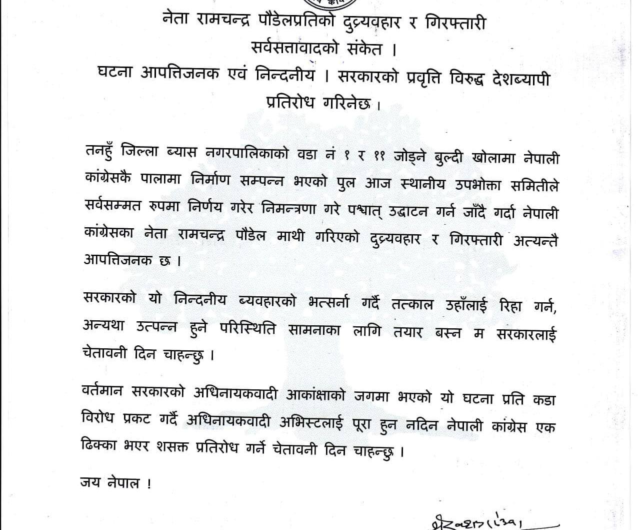 कांग्रेसले तनहुँको व्यास नगरपालिकाको वडा नं १ र ११ जोड्ने बुल्दी खोलामा निर्माण सम्पन्न पुलको बुधबार उद्घाटन गर्न जाने क्रममा वरिष्ठ नेताप्रति प्रहरी प्रशासनबाट दुर्व्यवहार गरिएकोमा गम्भीर आपत्ति प्रकट गरेको छ ।