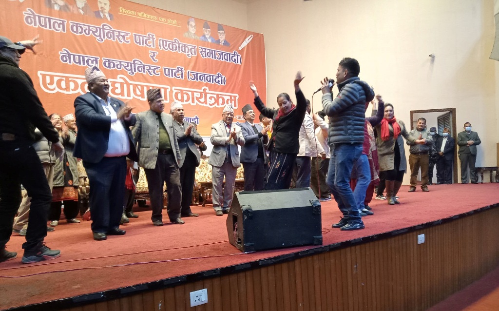 नेपाल कम्युनिस्ट पार्टी (एकीकृत समाजवादी) मा नेपाल कम्युनिस्ट पार्टी (जनवादी) मंगलबार समाहित हुनका लागि राष्ट्रिय सभागृहमा आयोजित कार्यक्रममा अतिथि दीर्घामा बसेका सबै अतिथिले प्रतिगमनका विरुद्ध सामूहिकरूपमा नृत्य कला प्रदर्शन गरेका थिए ।