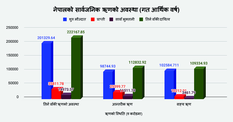 गत वर्षमा ऋणको साँवा ब्याज भुक्तानीमा सरकारले रू दुई खर्ब २२ अर्ब ७४ करोड २१ लाख खर्च गरेको छ । जसमध्ये, आन्तरिक ऋणको साँवा–ब्याज भुक्तानी रू एक खर्ब ७९ अर्ब ७२ करोड ५३ लाख र बाह्य ऋणको साँवा ब्याज भुक्तानीमा रू ४३ अर्ब एक करोड ६८ लाख बराबर खर्च भएको छ ।