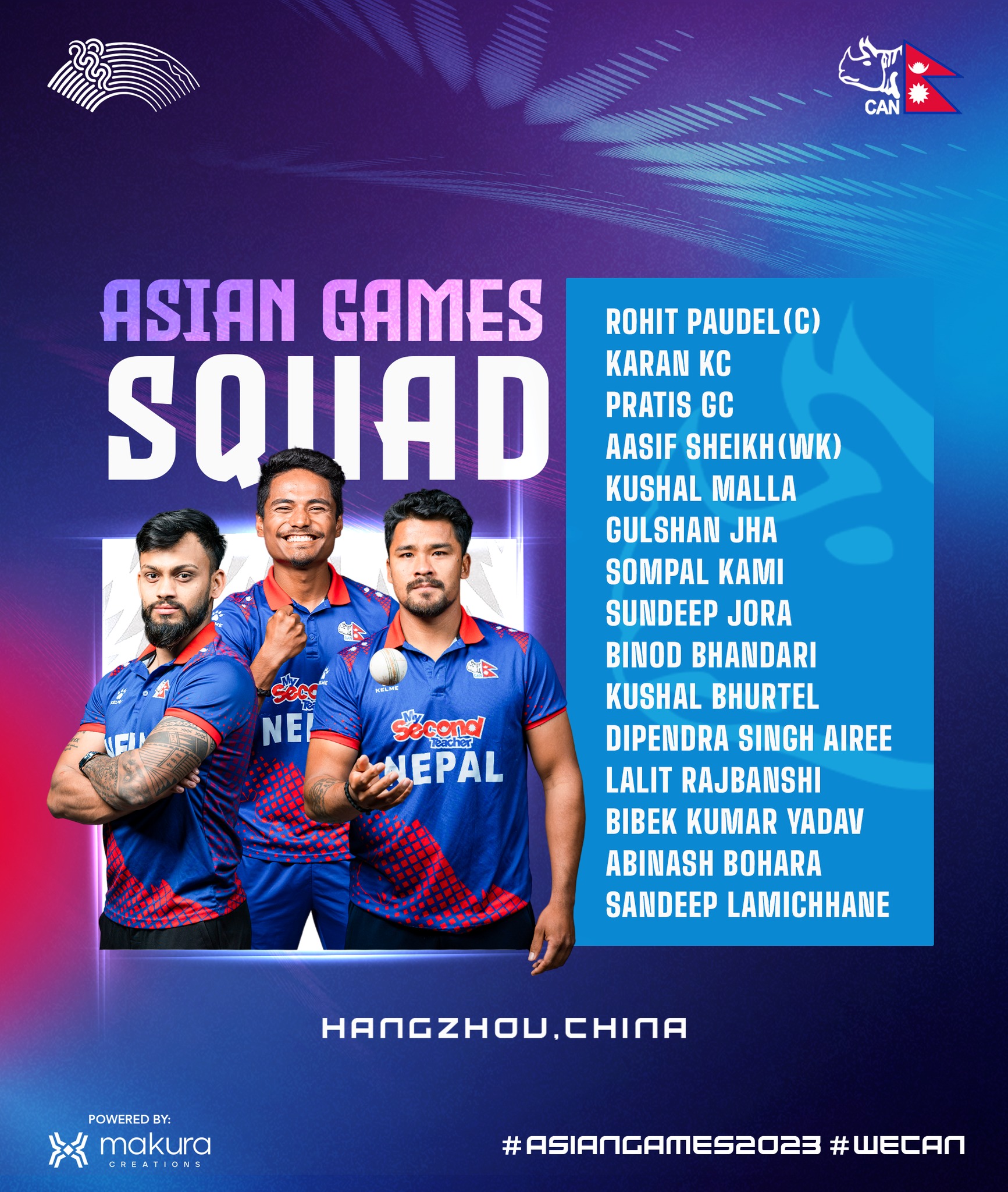 काठमाडौँ । आगामी असोज ६ गतेदेखि चीनको हाङझावमा सुरु हुने १९औँ एसियाली खेलकुद प्रतियोगितामा सहभागिता जनाउने नेपाली राष्ट्रिय क्रिकेट टोलीको नाम आज सार्वजनिक गरिएको छ ।
