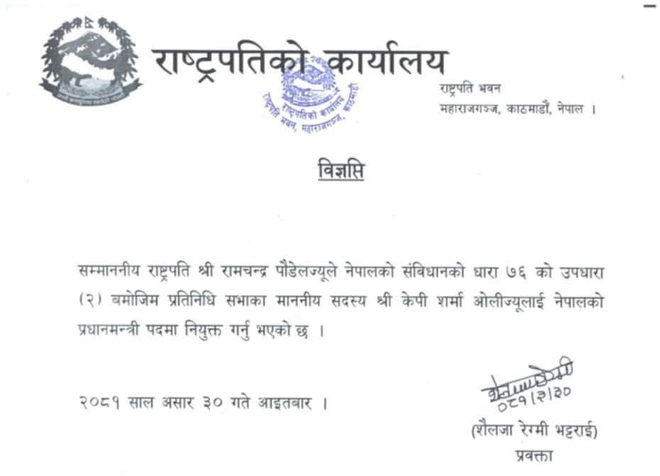 काठमाडौँ । राष्ट्रपति रामचन्द्र पौडेलले नेकपा (एमाले)का अध्यक्ष केपी शर्मा ओलीलाई प्रधानमन्त्रीमा नियुक्त गरेका छन् । राष्ट्रपति पौडेलले संविधानको धारा ७६ को उपधारा २ अनुसार ओलीलाई प्रधानमन्त्रीमा नियुक्त्त गरेका हुन् ।