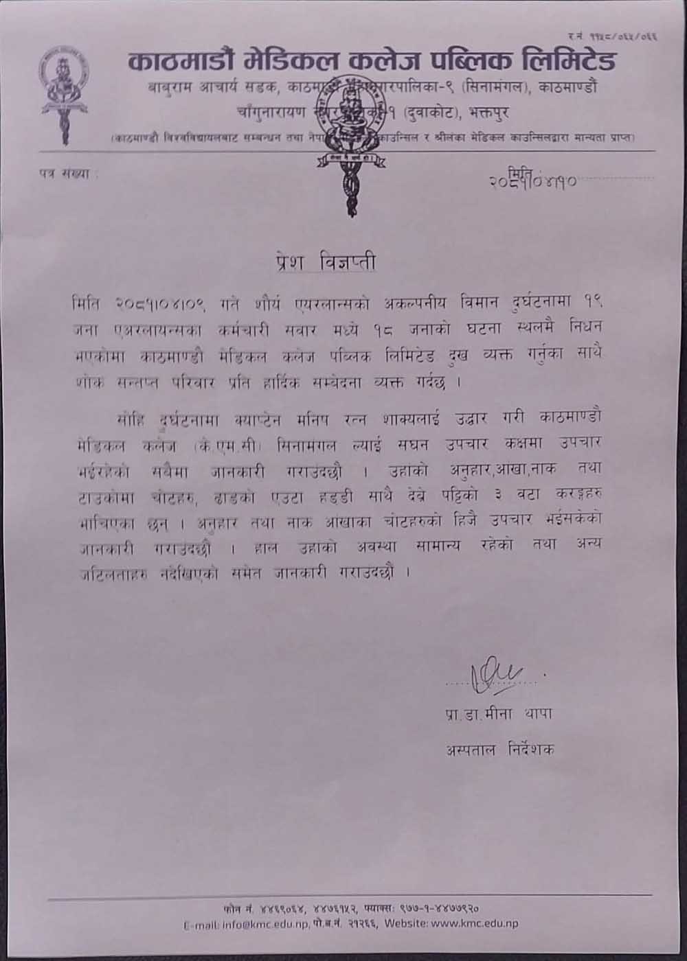 “क्याप्टेन शाक्यको स्वास्थ्य अवस्था सामान्य छ । उनको अनुहार, आँखा, नाक तथा टाउकोमा चोट लागेको छ, ढाडको एउटा हड्डी साथै देव्रेपट्टीका तीनवटा करङ्ग भाच्चिएका छन्”, विज्ञप्तिमा भनिएको छ । अस्पतालले विमान दुर्घटनामा मृत्यु भएकाप्रति दुःख व्यक्त गर्दै शोक सन्तप्त परिवारमा हार्दिक समवेदना व्यक्त गरेको छ ।