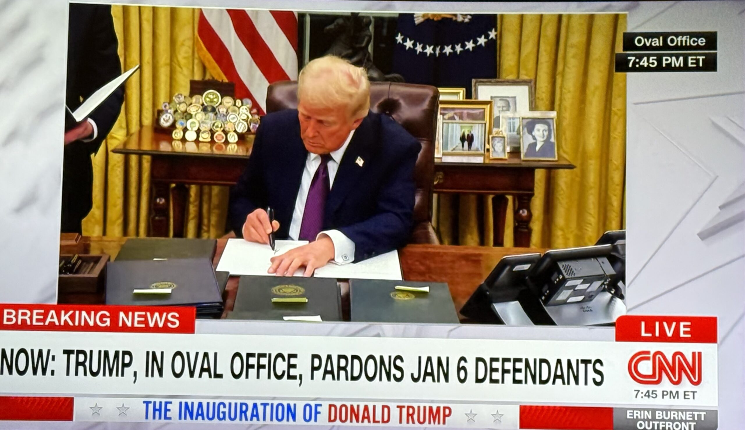 फेडरल कर्मचारीले कार्यालय मै उपस्थित भएर काम गर्नुपर्ने, बाइडेनका कार्यकालमा जारी भएका करिब ८० वटा कार्यकारी आदेश फिर्ता गर्ने, मेक्सिको बोर्डरमा आपत्काल घोषणा, ‘पेरिस क्लाइमेट चेन्ज ट्रीटी’बाट अमेरिका अलग्गिने लगायतका आदेश जारी गरेका राष्ट्रपति ट्रम्पले अहिले भर्खरै ओभल अफिसमा थप आदेशमा हस्ताक्षर गरेका छन्। त्यसमध्ये २०२१, जनवरी ६ मा संसद भवन आक्रमणमा संलग्न करिब १,५०० आक्रमणकारीहरुलाई क्षमादान गर्ने आदेश समेत समावेश छ। हाल जेलमा रहेका सयौं दंगाकारीहरु आज राती नै जेलबाट छुट्ने अनुमान गरिएको छ।