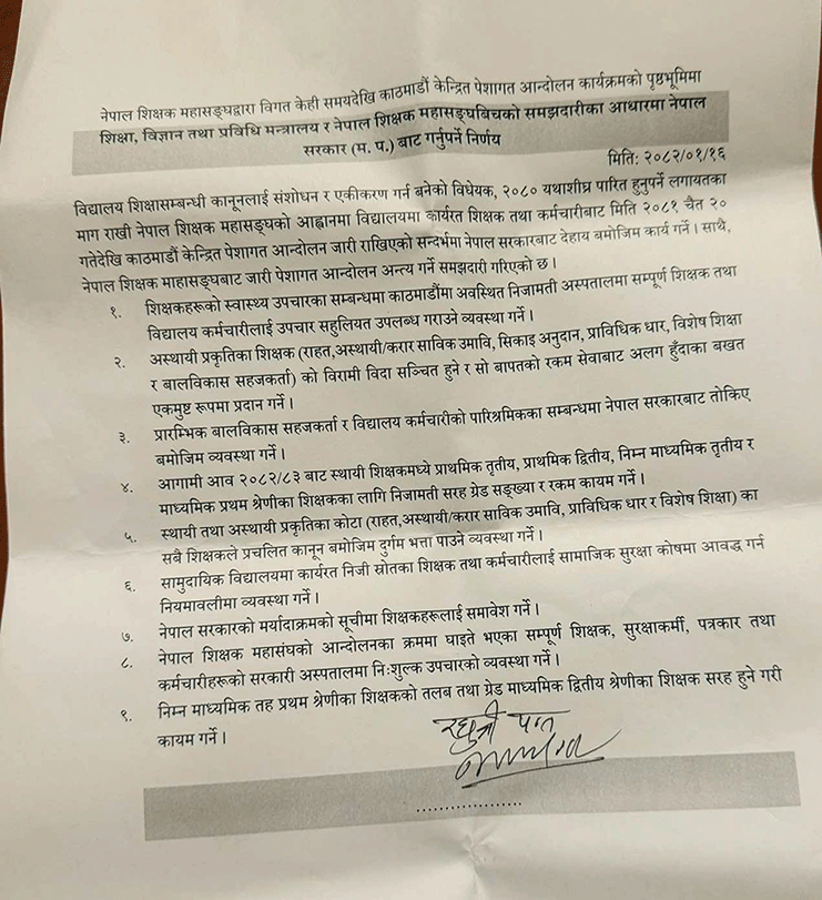 यस्ता छन् शिक्षकसँग सरकारका ९ बुँदे सहमति
