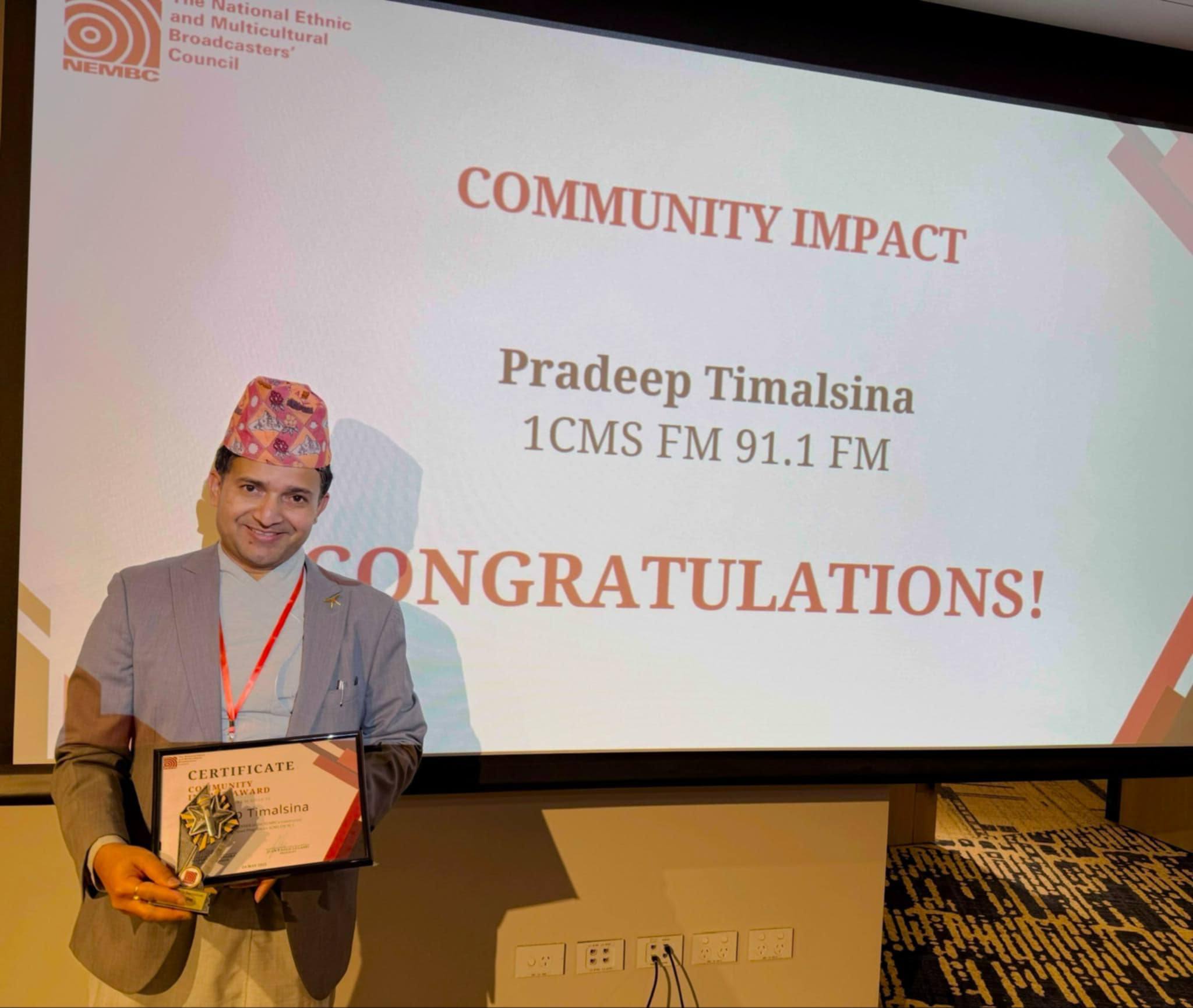 क्यान्बेरा । अष्ट्रेलियाको राजधानी क्यान्बेराको एफएम ९१.१ मा नेपाली भाषाको रेडियो कार्यक्रम निर्माता तथा सञ्चालक प्रदीप तिमल्सिना अष्ट्रेलियाको भाषाभाषीहरुको प्रसारक छाता संगठन नेसनल इथ्निक एण्ड मल्टीकल्चरल काउन्सिल अफ अष्ट्रेलिया (एनएमबिसी)द्वारा हरेक वर्ष प्रदान गरिने कम्युनिटी इम्प्याक्ट अवार्ड २०२५ बाट सम्मानित भएका छन् ।