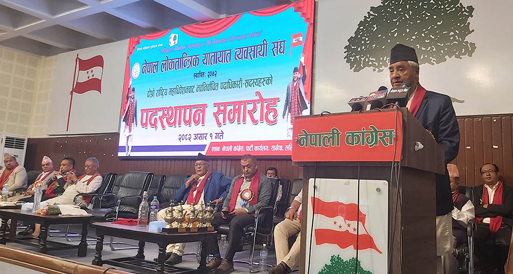 नेपाली कांग्रेसको केन्द्रीय कार्यालय सानेपामा आइतबार आयोजित नेपाल लोकतान्त्रिक यातायात व्यवसायी सङ्घको दोस्रो राष्ट्रिय महाधिवेशनबाट निर्वाचित पदाधिकारी तथा सदस्यहरुको पदस्थापन समारोहमा सभापति देउवाले व्यावसायिक हक–हितको संरक्षणसँगै आम नागरिकलाई भरपर्दो यातायात सेवा उपलब्ध गराउनु साझा दायित्व भएको उल्लेख गरे । दुर्घटना न्यूनीकरणको दिशा र सुरक्षित यात्राको सुनिश्चितताका लागि यातायात व्यवसायीको भूमिका महत्त्वपूर्ण हुने उनको भनाइ थियो ।