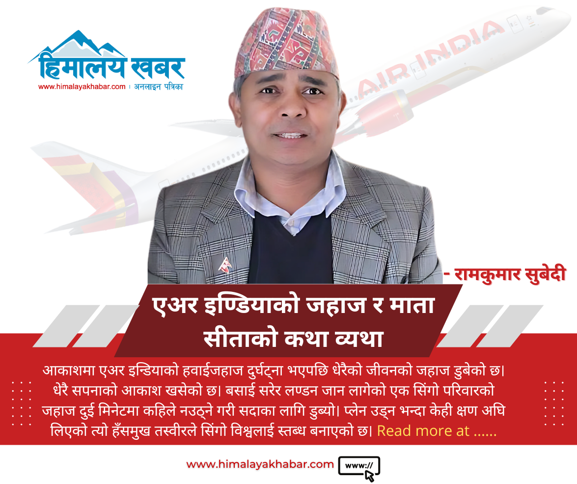 आकाशमा एअर इन्डियाको हवाईजहाज दुर्घट्ना भएपछि धेरैको जीवनको जहाज डुबेको छ। धेरै सपनाको आकाश खसेको छ। बसाई सरेर लण्डन जान लागेको एक सिंगो परिवारको जहाज दुई मिनेटमा कहिले नउठ्ने गरी सदाका लागि डुब्यो। प्लेन उड्न भन्दा केही क्षण अघि लिएको त्यो हँसमुख तस्वीरले सिंगो विश्वलाई स्तब्ध बनाएको छ।