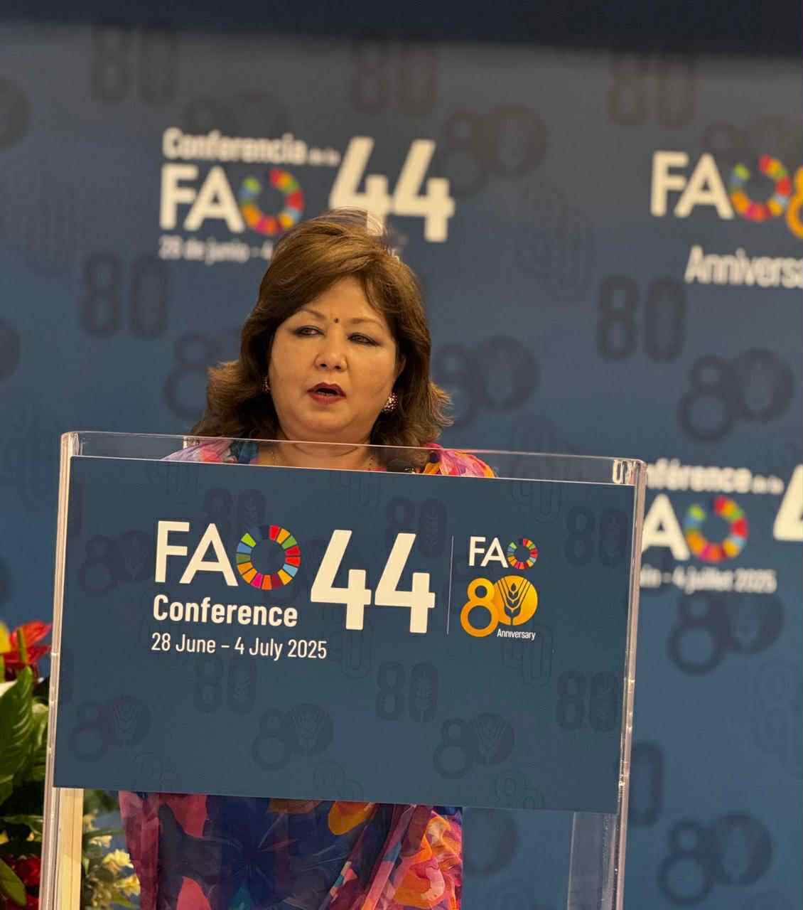 रोममा आयोजित राष्ट्रसंघीय खाद्य तथा कृषि संगठनको ४४औँ महासभालाई सोमबार सम्बोधन गर्दै उनले जलवायु परिवर्तनको मार खेपिरहेका नेपाल र यहाँका विशेषगरी हिमाली क्षेत्रका लागि अनुदानमा आधारित अन्तर्राष्ट्रिय जलवायु वित्त सुनिश्चित गर्न आग्रह गरिन् ।