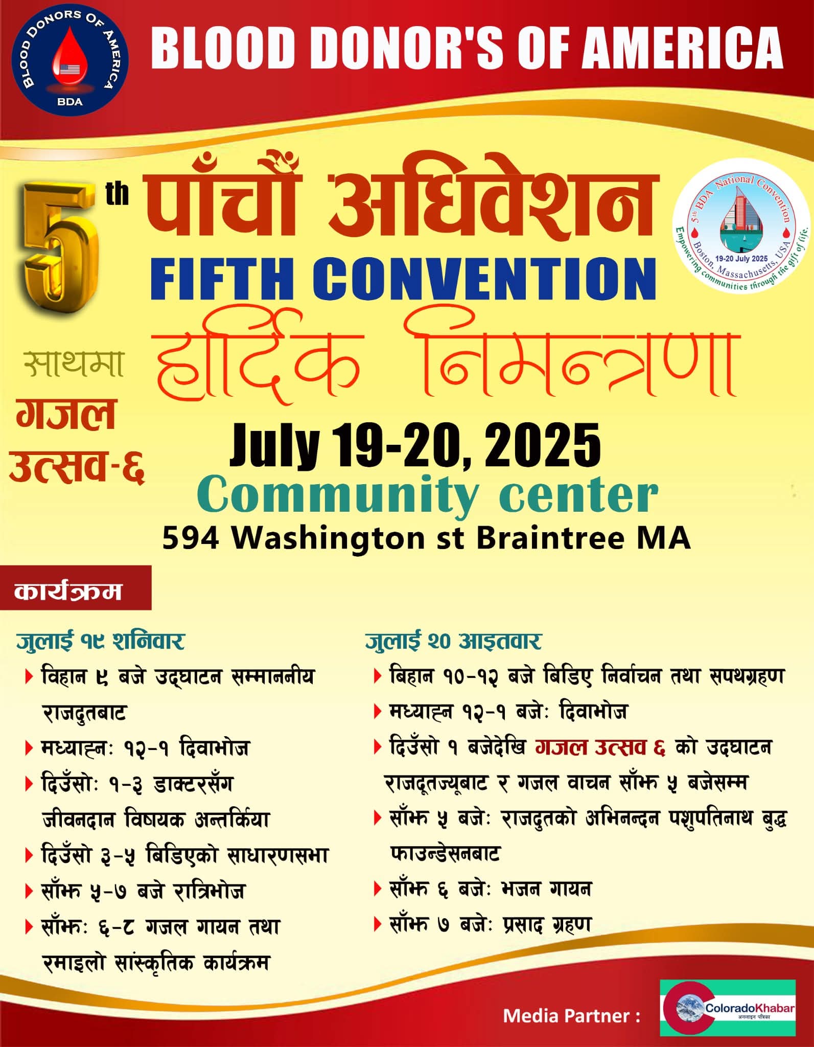 अमेरिका, बोस्टन। अमेरिकाको बोस्टन सहरमा हुनगइरहेको ब्लड डोनर्स अफ अमेरिकाको पाँचौं राष्ट्रिय अधिवेशनको सम्पूर्ण तयारी पूरा भएको छ। ‘रक्तदान, जीवन दान’ लाई संस्थाको मूल मन्त्र बनाएर परोपकारी अभियानमा जुट्दै आइरहेको बिडिएको पाँचौं अधिवेशन जुलाई १९ र २०, २०२५ २०२५ (शनिवार र आइतबार) म्यासाच्युसेट्स राज्यको ब्रेनट्री स्थित नेपाली सामुदायिक भवनमा हुदैछ।
