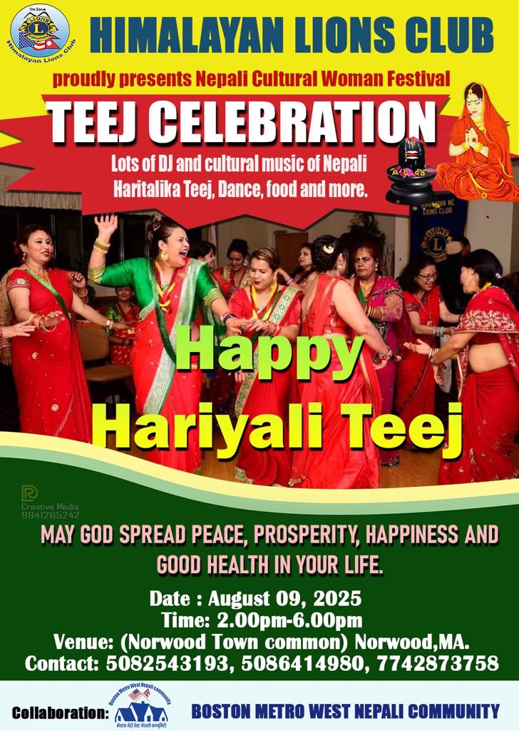 यसैक्रममा, हरेक वर्ष झैं यस वर्ष पनि अमेरिकाको बोस्टन स्थित ‘हिमालयन लायन्स क्लब, डिस्ट्रिक ३३ के’ले पनि ‘खुला हरितालिका तीज बिशेष कार्यक्रम’ गर्ने भएको छ। क्लबले उक्त कार्यक्रम बोस्टन मेट्रोवेस्ट नेपाली कम्युनिटीको सहयोगमा गर्न लागेको हो। क्लबले जनाए अनुसार, उक्त तीज विशेष कार्यक्रम यही आउदो अगस्ट ९,२०२५ शनिवार साँझ नोरउड टाउन कमन(Norwood Town Common) मा गर्ने गरी तयारी सुरु गरिसकेको छ।