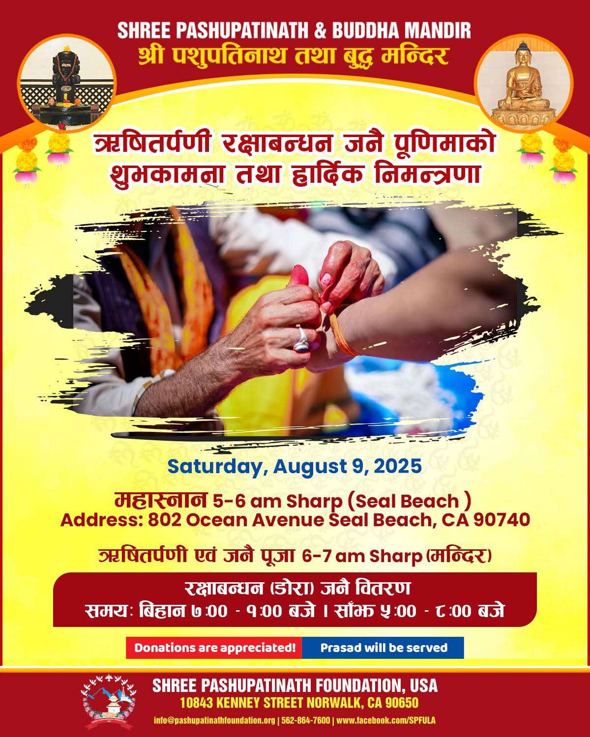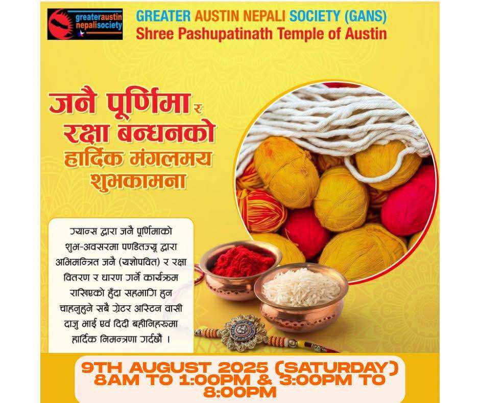 अस्टिनको पशुपतिनाथ मन्दिर, ह्युस्टन, भर्जिनिया, न्यूयोर्क र क्यालिफोर्निया (सानफ्रान्सिस्को र लसएञ्जलस) का नेपाली मन्दिरहरुले शनिबार जनैपूर्णिमा भव्य रुपमा मनाउँदैछन् ।