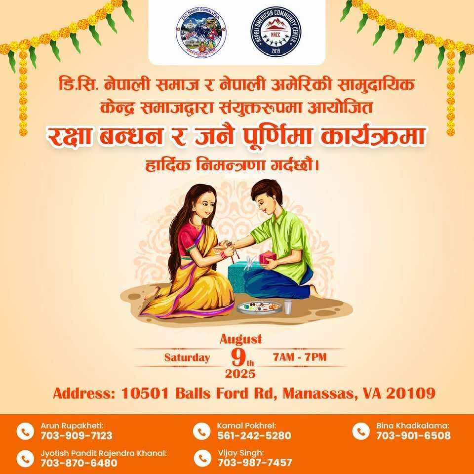 भर्जिनिया र मेरिल्याण्डमा रहेका नेपाली मन्दिरहरुले पनि शनिबारै रक्षावन्धन राखेका छन् । भर्जिनियाको मनाससस्थित नेपाली सामुदायिक मन्दिरले शनिबार बिहान ७ देखि साँझ ७ बजेसम्म रक्षावन्धन कार्यक्रम राखेको छ ।