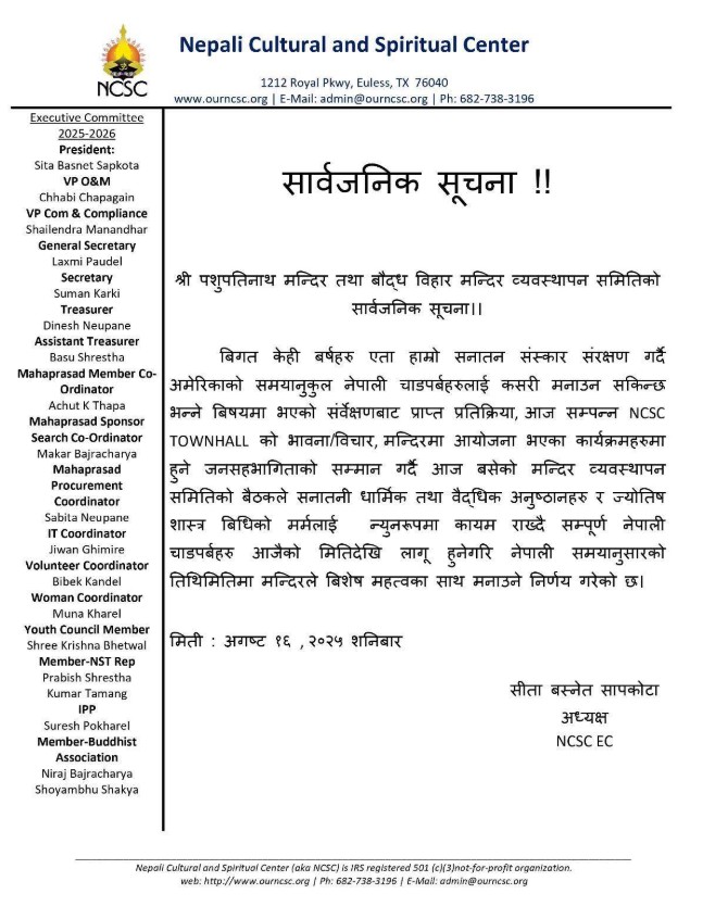ड्यालस (अमेरिका) । अमेरिकाको टेक्सस राज्यको ड्यालसमा रहेको नेपाली सांस्कृतिक तथा आध्यात्मिक केन्द्र (NCSC) ले अबदेखि नेपाली चाडपर्व मनाउँदा नेपालकै क्यालेण्डरलाई आधार मान्ने निर्णय लिएको छ ।