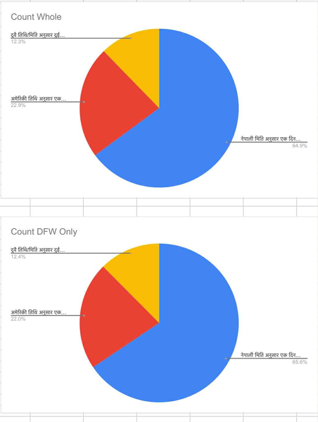 गत हप्ता लिइएको पर्व कहिले मनाउने भन्ने सर्वेक्षणमा ६५ प्रतिशतले नेपाली क्यालेण्डर अनुसार गर्नुपर्ने सुझाव दिएका थिए । त्यस्तै २२ प्रतिशतले अमेरिकाको स्थानीय समय र तिथि अनुसार मनाउनुपर्ने र झण्डै १३ प्रतिशतले दुबै दिन मनाउँदा पनि हुने भनेर सुझाव दिएका थिए ।