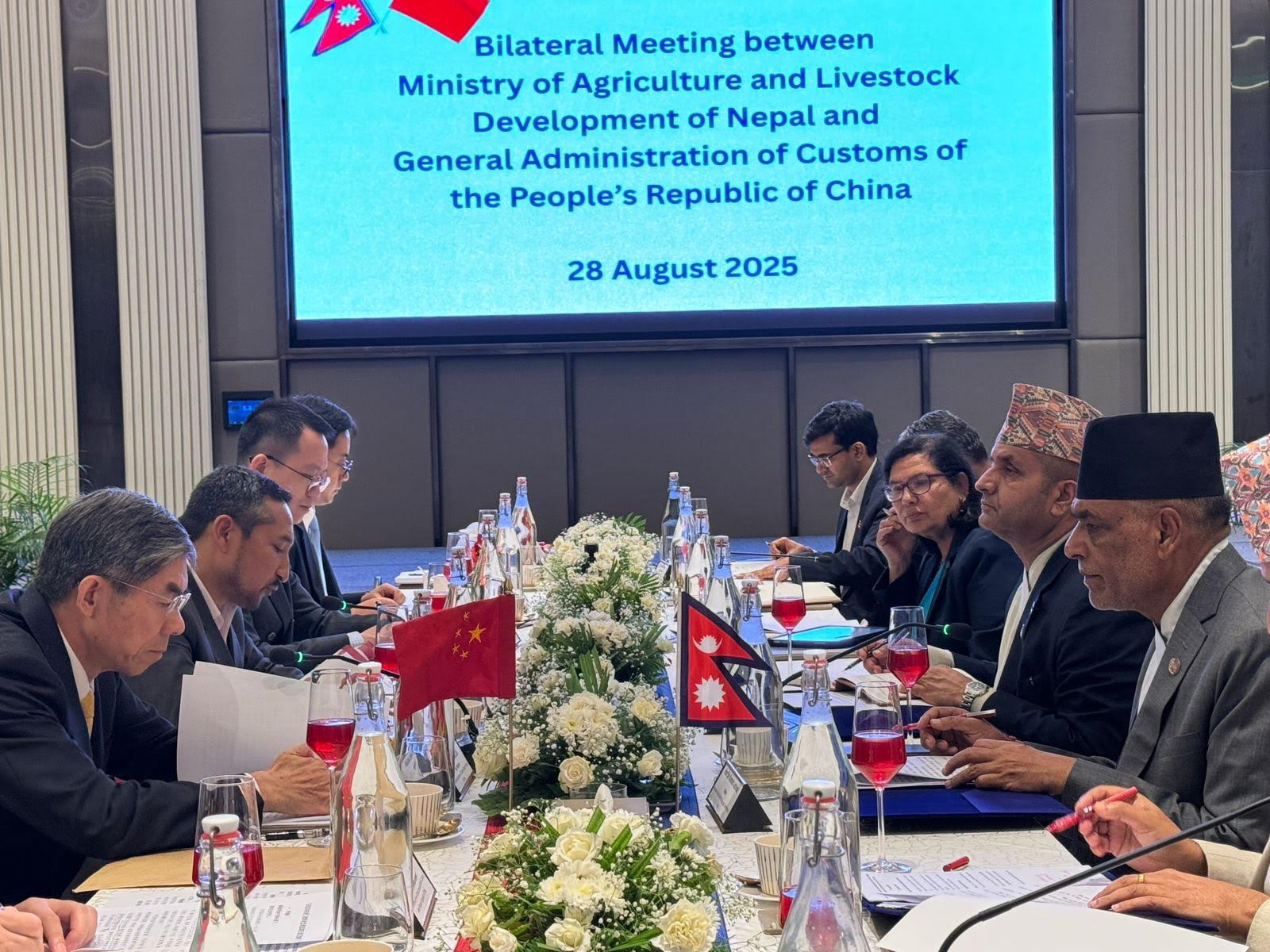 चीनको भन्सार प्रशासन र कृषि तथा पशुपन्छी मन्त्रालयका उच्च अधिकारीबीच काठमाडौँमा भएको द्धिपक्षीय बैठकमा नेपालले गरेको आग्रहलाई चिनियाँ पक्षले सकारात्मकरूपमा लिएको जनाएको छ । बैठकमा नेपालको नेतृत्व कृषि तथा पशुपन्छी विकासमन्त्री रामनाथ अधिकारीले गरेका थिए भने चीनको भन्सार प्रशासनका उपमन्त्री वाङ्ग लिङजुनले चिनियाँ पक्षको नेतृत्व गरेका थिए ।