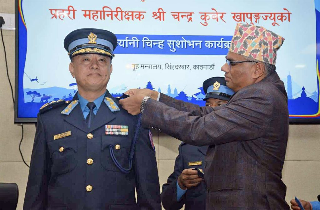 काठमाडौँ । नवनियुक्त प्रहरी महानिरीक्षक चन्द्रकुवेर खापुङले बिहीबार दर्ज्यानी चिह्न लगाएका छन् । सिंहदरबारस्थित गृह मन्त्रालयमा आयोजित समारोहबीच गृहसचिव गोकर्णमणि दुवाडीले उनलाई दर्ज्यानी चिह्न लगाइदिएका हुन् ।