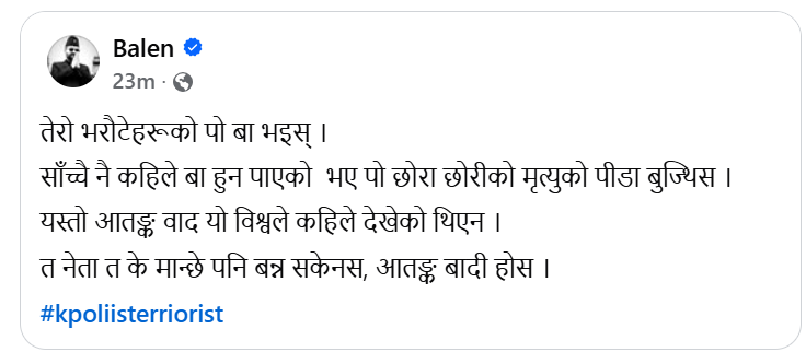 बालेनले स्टाटसमा लेखेका छन्, “तेरो भरौटेहरूको पो बा भइस् । साँच्चै नै कहिले बा हुन पाएको भए पो छोरा छोरीको मृत्युको पीडा बुझ्थिस । यस्तो आतंकवाद यो विश्वले कहिले देखेको थिएन । त नेता त के मान्छे पनि बन्न सकेनस्, आतंकवादी होस्,”