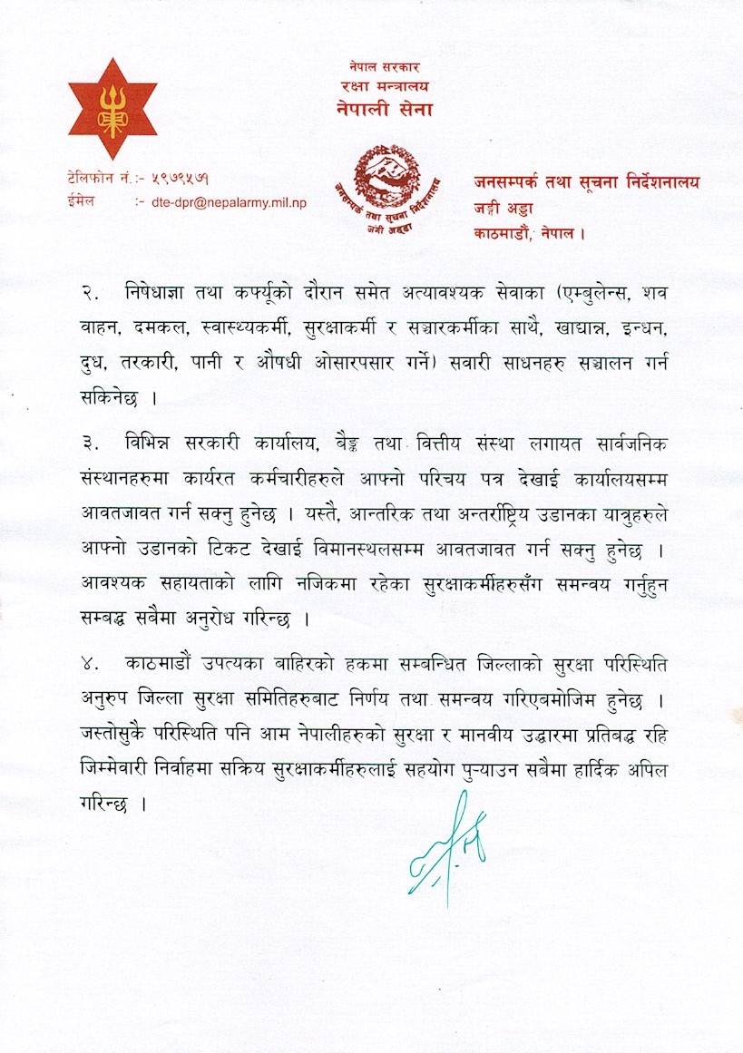 यस्तै, विभिन्न सरकारी कार्यालय, बैंक तथा वित्तीय संस्थाका कर्मचारीहरूले आफ्नो परिचयपत्र देखाएर कार्यालय आवतजावत गर्न पाउने व्यवस्था मिलाइएको सेनाले जनाएको छ।