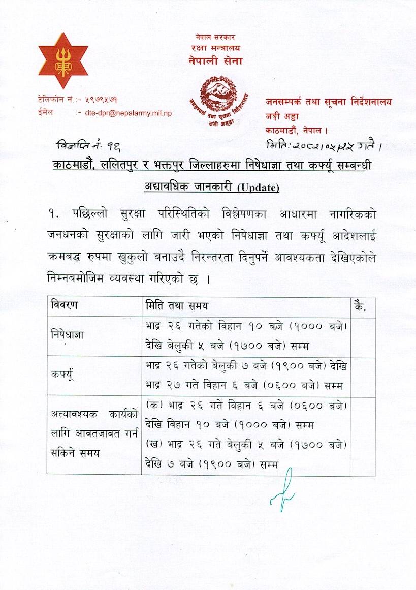 सेनाले जारी गरेको विज्ञप्तिअनुसार भदौ २६ गते बिहान १० बजेदेखि बेलुकी ५ बजेसम्म निषेधाज्ञा लागू हुनेछ भने बेलुकी ७ बजेदेखि बिहान ६ बजेसम्म कर्फ्यु कायम रहनेछ।