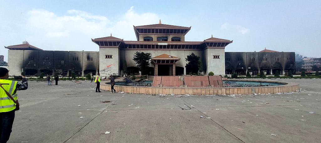 काठमाडौँ । ‘जेनजी’ समूहको आन्दोलनका पहिलो निशानामा परेको नयाँ बानेश्वरस्थित सङ्घीय संसद् भवनभित्रको चौघेराबाहेक सम्पूर्ण संरचना ध्वस्त भएका छन् ।