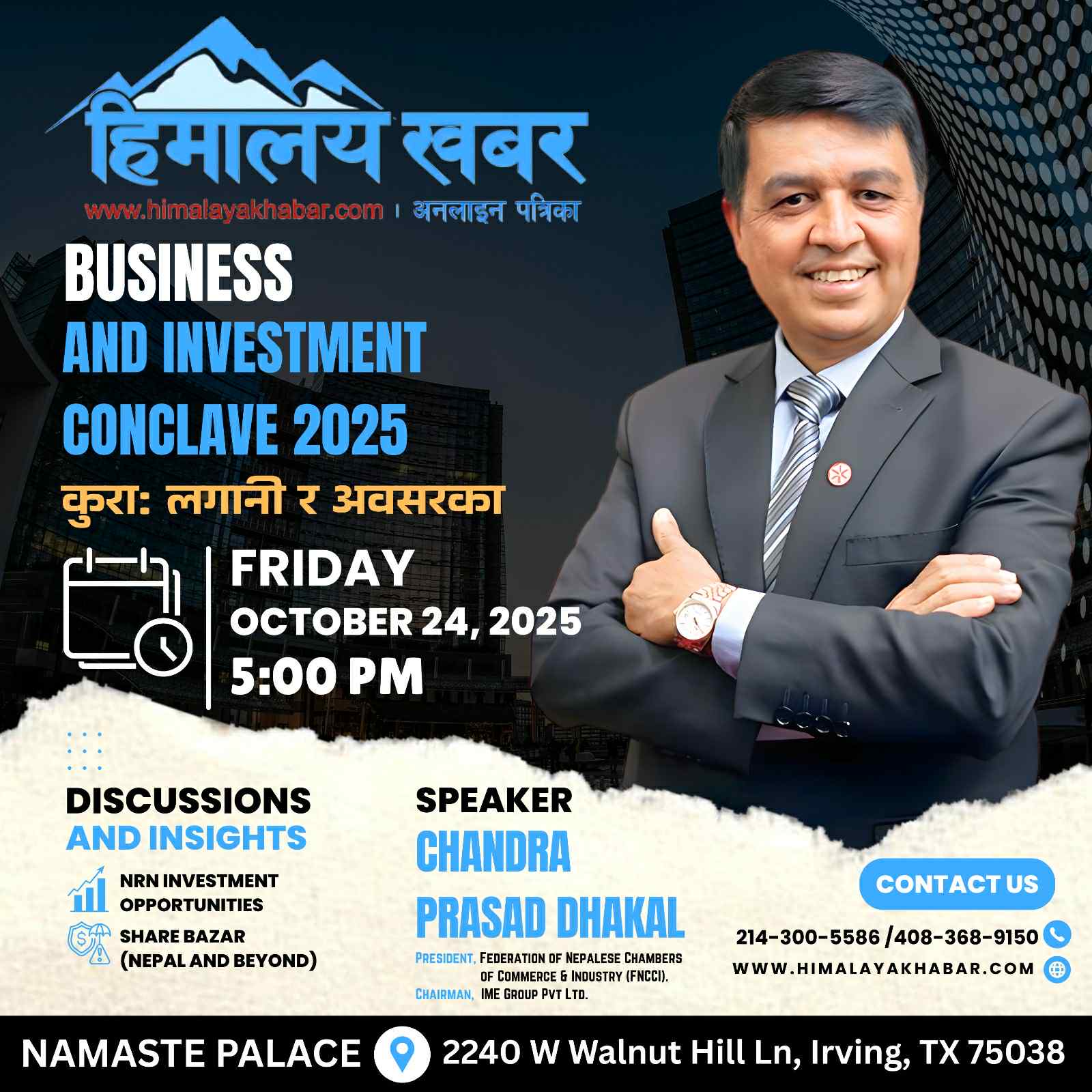 अर्भिंग, टेक्सस — नेपाली डायस्पोरा समुदायमा आर्थिक सम्भावना र लगानीको विषयमा गहिरो चासो बढ्दो छ। यही सन्दर्भमा, आगामी शुक्रबार साँझ अर्भिंगको नमस्ते प्यालेसमा ‘हिमालय खबर व्यापार तथा लगानी सम्मेलन २०२५’ आयोजना हुँदैछ।