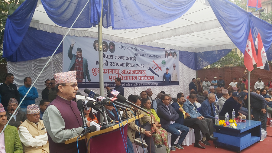 नेपाल तरुण दलको ७३औँ स्थापना दिवसका अवसरमा नेपाली कांग्रेसको केन्द्रीय कार्यालय सानेपामा आज आयोजित शुभकामना आदानप्रदान एवम् चियापान कार्यक्रममा उनले नेपाल इतिहासकै प्रतिकूल अवस्थामा उभिएको र कांग्रेस पार्टीसमेत प्रतिकूल अवस्थामा रहेको उल्लेख गर्दै देश जोगाउन सङ्कल्पसहित अगाडि बढ्न आग्रह गरे।