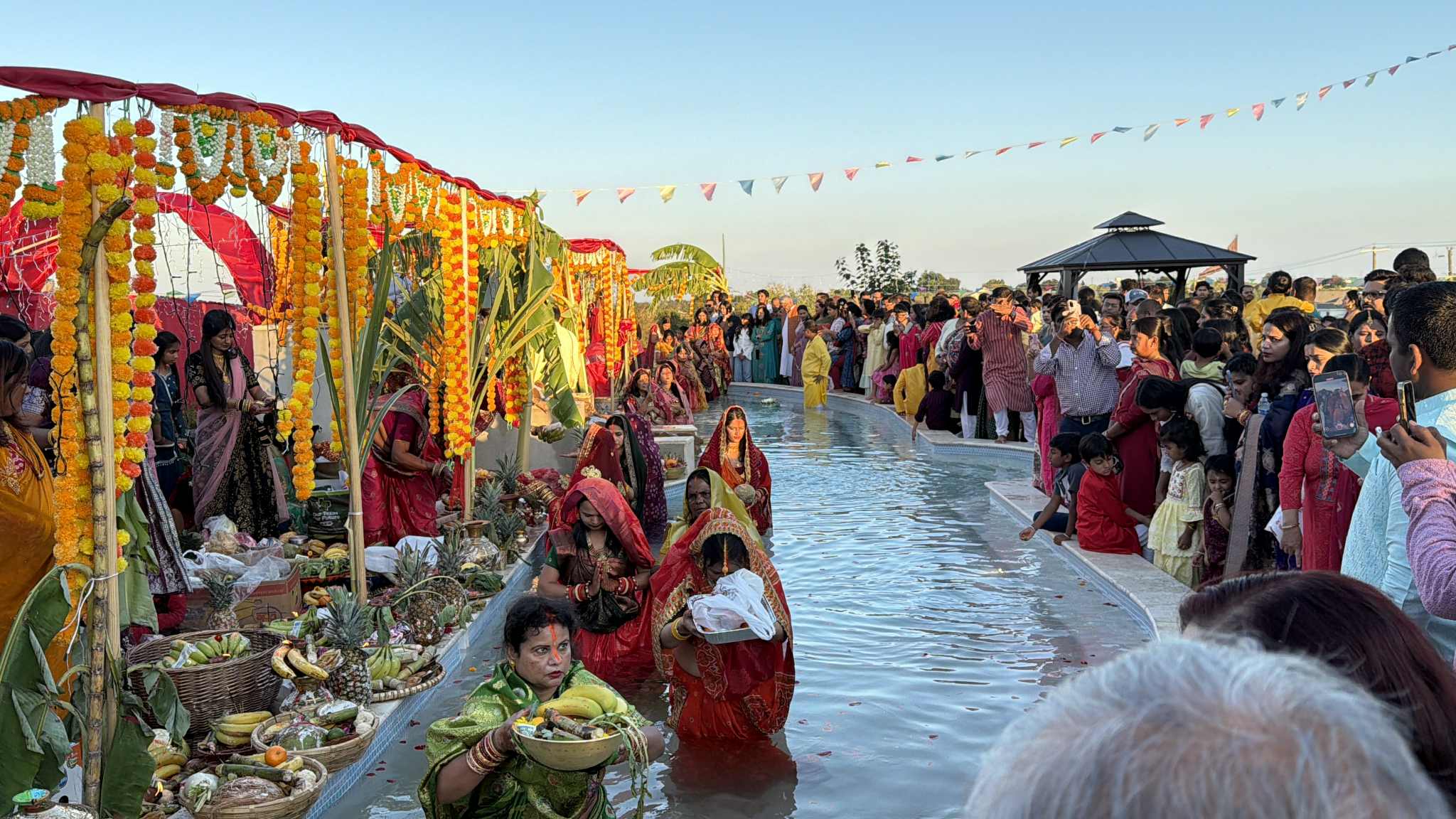 कार्यक्रममा महिलाहरूले परम्परागत पहिरन धारण गरी जलमा उभिएर अस्ताउँदो सूर्यलाई अर्घ्य अर्पण गरे। मन्दिर परिसर र रंगीन मालाले सजिएका मण्डपहरूले वातावरणलाई नेपालकै झल्को दिने बनाएको थियो। उपस्थित भक्तहरूले फलफूल, ठेकुवा, कसार र अन्य प्रसादका साथ सूर्य भगवान् र छठी माईको पूजा गरे।