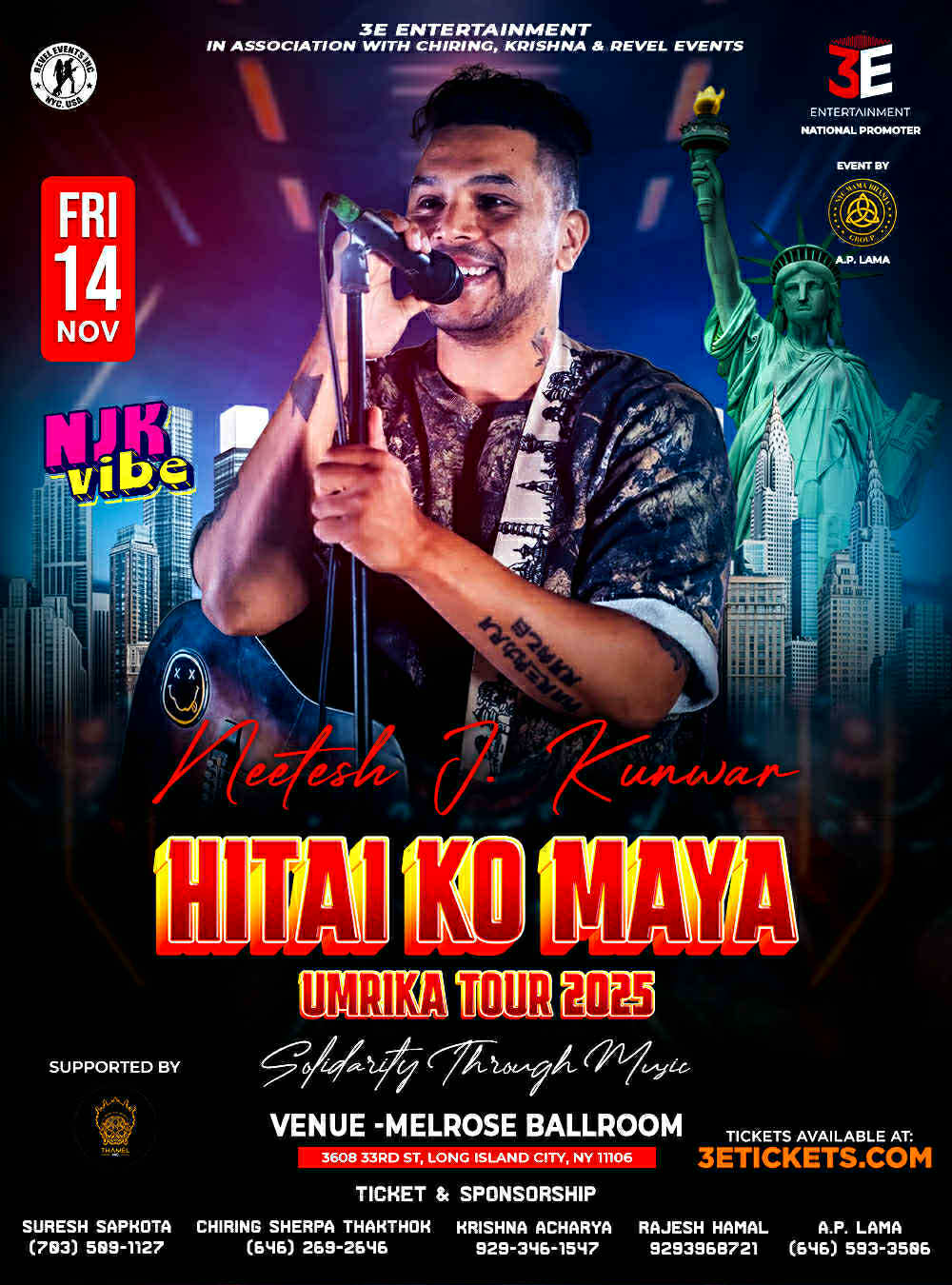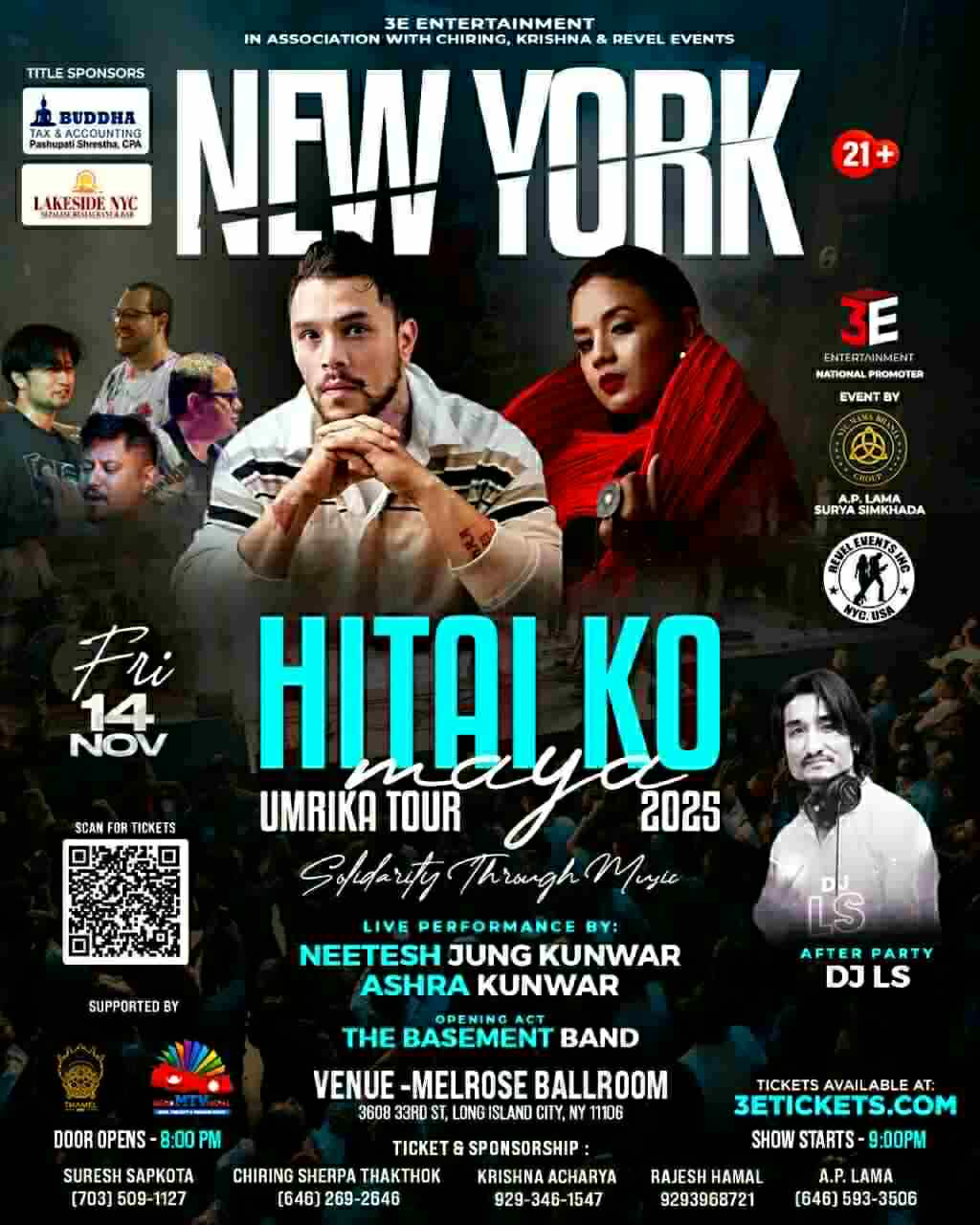 न्युयोर्क सीटीकोल मेलरोज बलरुममा हुने सांगितिक सन्ध्यामा चर्चित गायक नितेश जंग कुँवर, आशा कुँवर मुख्य आकर्षणको रुपमा रहनेछन । साथै सांस्कृतिक प्रबद्र्धक सुरेश सापकोटाकोपनि सहभागिता रहने छ ।