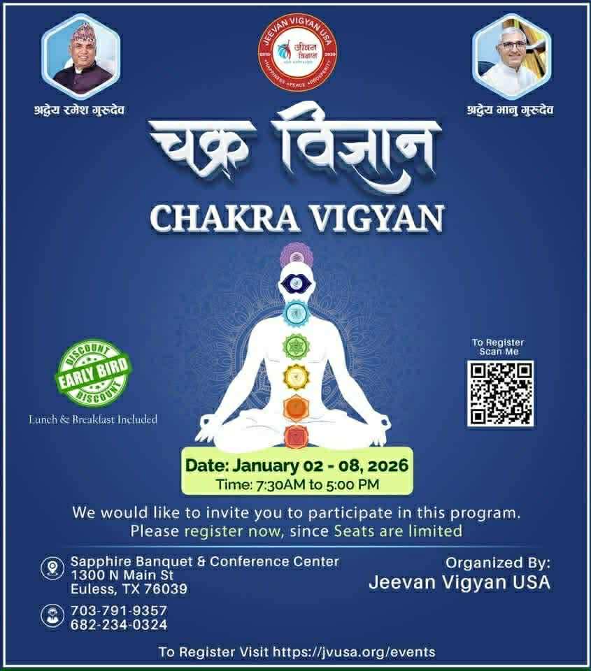 ड्यालस (अमेरिका) । जीवन विज्ञानको एउटा पाटोको रुपमा रहेको चक्र विज्ञान योग ध्यान शिविर आउँदो जनवरी पहिलो साता अमेरिकाको ड्यालसमा हुने भएको छ ।