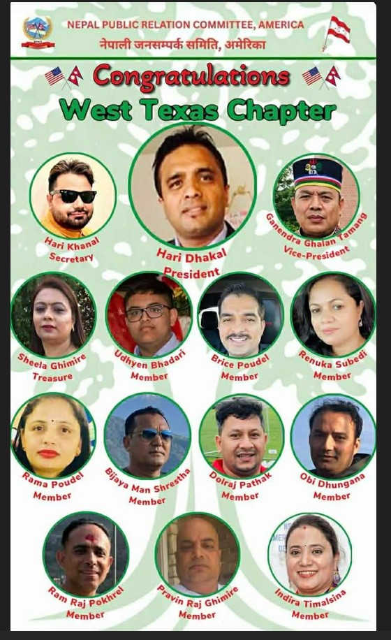 बिभिन्न स्थानमा रहेका हिमालय खबरका प्रतिनिधिहरुले पठाएको समाचार विवरण अनुसार जनसम्पर्क समिति वेष्ट टेक्ससको अध्यक्षमा हरिप्रसाद ढकाल चयन भएका छन् ।
