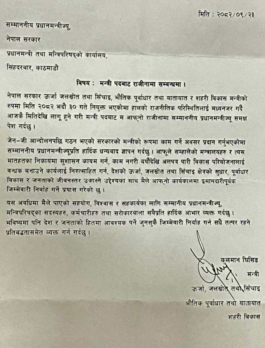 अमेरिका। सुशीला कार्की नेतृत्वको वर्तमान अन्तरिम सरकारका सहरी विकास, ऊर्जा, जलस्रोत तथा सिँचाइ र भौतिक पूर्वाधार तथा यातायात मन्त्री कुलमान घिसिङ सरकारबाट बाहिरिएका छन्। आज पौष २३ गते बुधवार प्रधानमन्त्री कार्की समक्ष आफ्नो राजिनामा पेश गरेर उनि सरकारबाट बाहिरिएका हुन्।