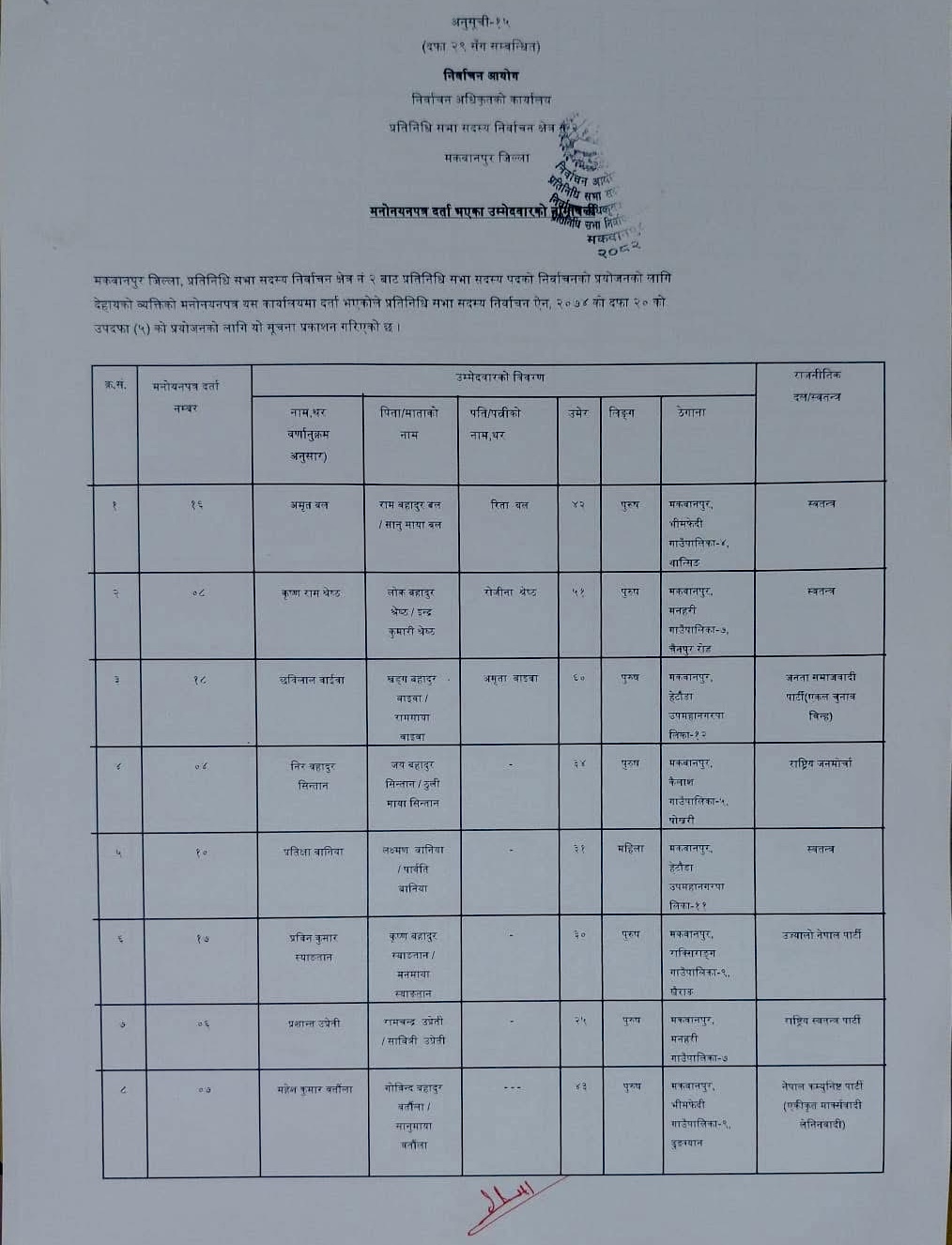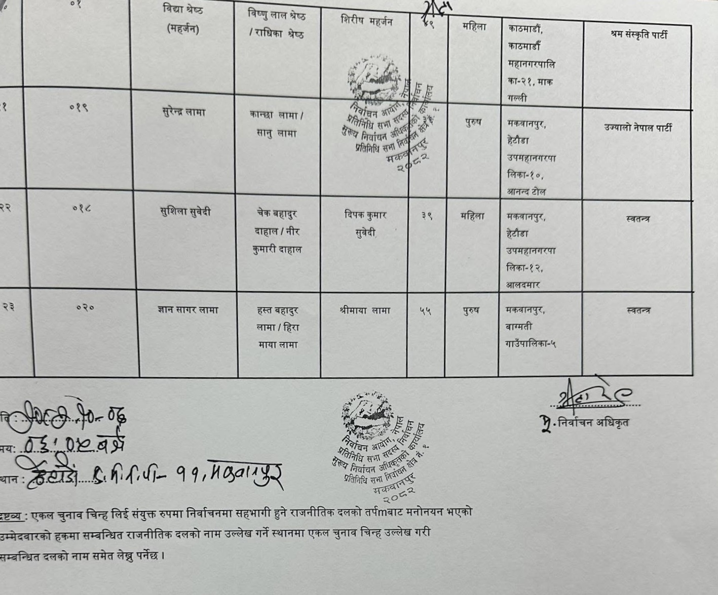 यही फागुन २१, २०८२ मा हुने भनिएको निर्वाचनमा नेपाली कांग्रेस पार्टीको तर्फबाट आधिकारिक उमेदवारका रुपमा मकवापुर क्षेत्र नंबर १ का लागि महालक्ष्मी उपाध्याय(डिना) र क्षेत्र नंबर २ का लागि बुद्ध लामाले आफ्नो मनोनयन दर्ता गरेका छन्। मङ्गलबार आफ्नो उमेदवारी मनोनयन दर्तासंगै दुबैले देश र पार्टी दुबै विषम परिस्थितिबाट गुज्रिरहेको र बदलिदो परिस्थितिलाई सम्हालेर त्यसबाट मुक्ति दिलाउन सक्ने सक्षम र योग्य पार्टी केवल नेपाली कांग्रेस मात्र भएकाले त्यसलाई जनताले मनन गरेर कांग्रेसलाई विजयी बनाउने विश्वास व्यक्त गरे।