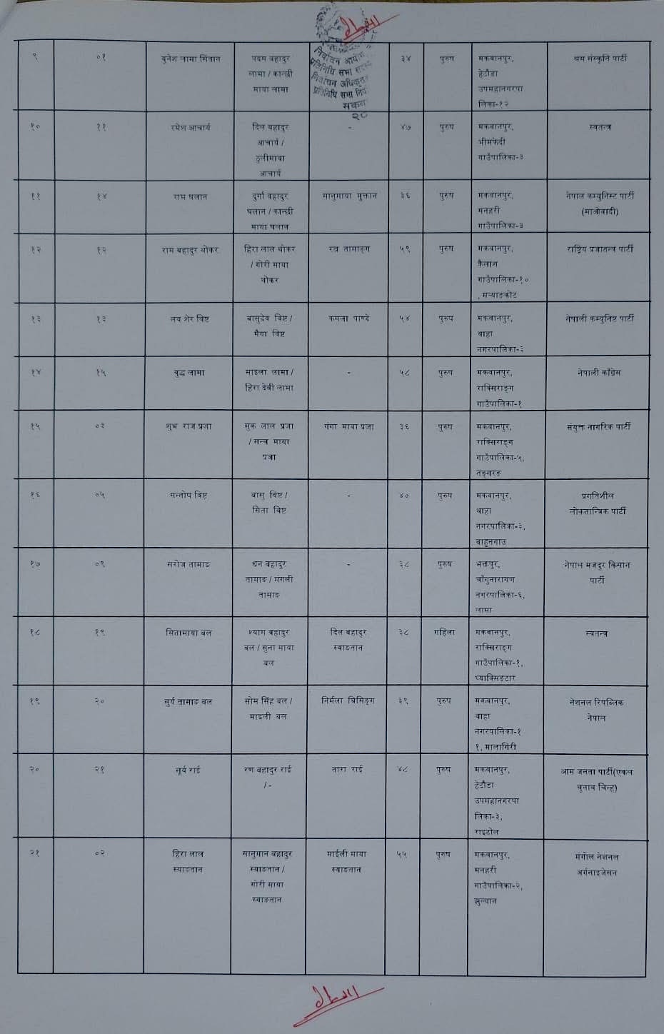 आसन्न संसदीय निर्वाचनमा मकवानपुरमा जम्मा ४४ जनाले मनोनयन दर्ता गरी चुनावी मैदानमा उत्रिएका छन्। जस मध्य निर्बाचन क्षेत्र नं १ मा जम्मा २३ जना (१३ जना दलीय उमेदवार र १० जना स्वतन्त्र उमेदवार) उमेदवार रहेका छन् भने, निर्वाचन क्षेत्र नंबर २ मा जम्मा २१ जना (१६ जना दलीय उमेदवार र ५ जना स्वतन्त्र उमेदवार) उमेदवार रहेका छन्।