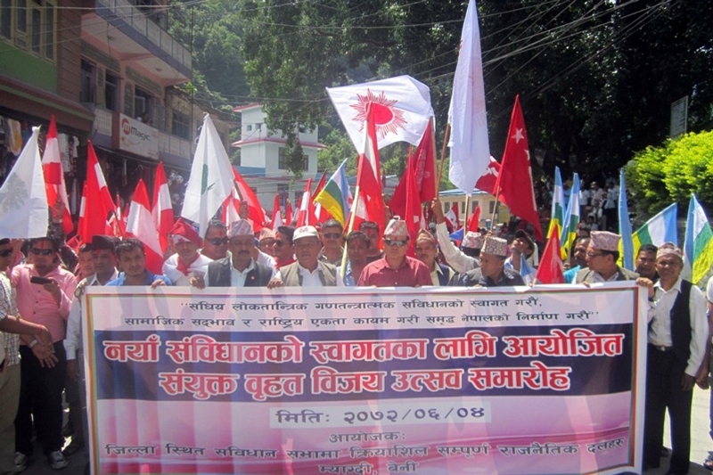 ‘संविधान जारी भएसँगै राजनीतिक सङ्क्रमण अब सकारात्मक मोडमा पुगेको छ’– उनले भने, ‘असन्तुष्ट दलका भावनासमेतलाई समेट्दै देशलाई समृद्धि र विकासको मार्गमा लैजानुपर्छ ।’