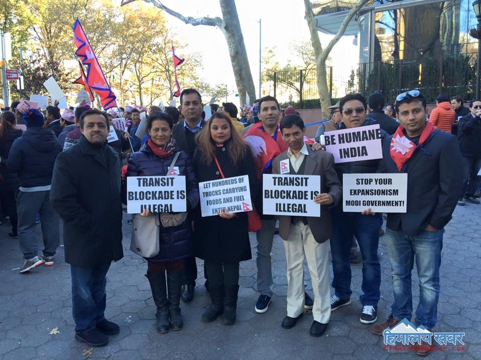 नोभेम्वर १७, एन आर एन अमेरिकाको तत्वाधानमा आज न्यूर्योक स्थित राष्ट्रसंघ कार्यालय अगाडि भारतीय नाकावन्दी विरुद्ध भव्य विरोध कार्यक्रम सम्पन्न भयो । दिनको करीव १२ वजे वाट शुरु भएको उत्त कार्यक्रमका दौरान भारत विरोधी विभिन्न नाराहरु लागेका थिए । एन आर एन अध्यक्ष डा. केशव पौडेलको नेतृत्वमा भएको उक्त कार्यक्रममा ठूलो संख्यामा सर्वसाधरण विरोधी नारा लेखिएको प्लेकार्ड सहित उपस्थित भएका थिए । यसै विच एन आर एन मिडिया कोर्डिनेटर सर्वज्ञ वाग्लेका अनुसार विरोध कार्यक्रममा नेपालीहरु मात्र नभै भारतीयहरु र अन्य मुलुकका विदेशीहरुले पनि साथ दिएका थिए ।