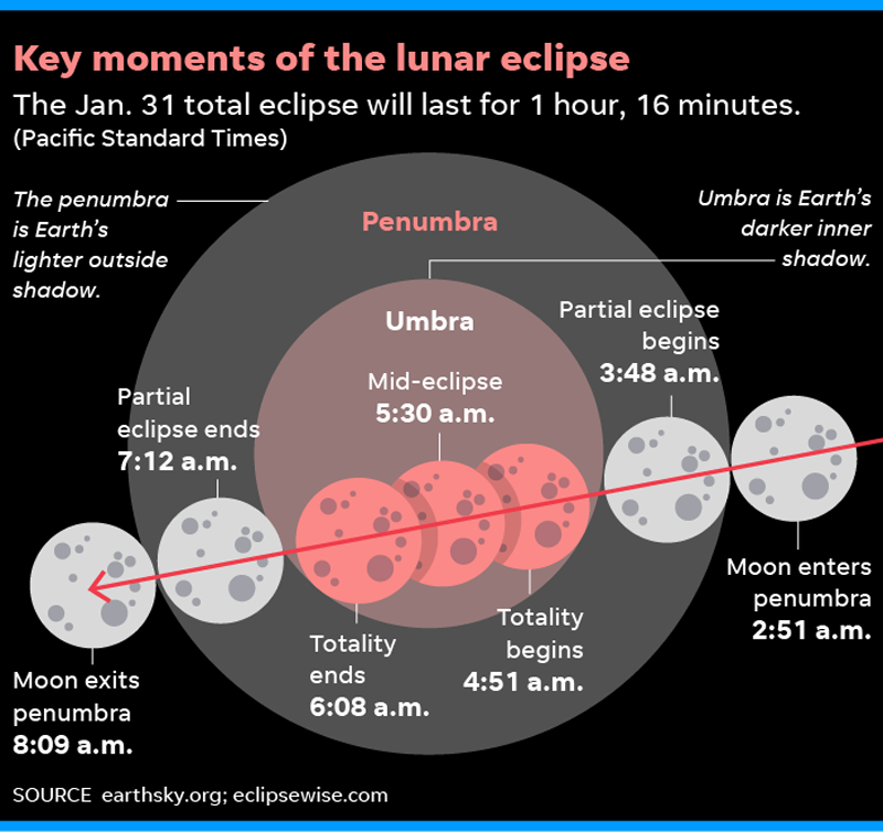 अमेरिकाका राज्यहरू हवाई, आलास्कावाट सुरु हुने बुधवार बिहानको चन्द्र ग्रहण अमेरिकाको मध्ये देखि पश्चिम क्षेत्रमा देखिने छ । टेक्सस, कोलोराडो राज्यमा पनि चन्द्र ग्रहण देखिने छ । माघ पूर्णिमाका दिन चन्द्रग्रहण लाग्नुलाई दिव्य संयोग मानिएको छ । सुपर मुन, ब्लुमुन र ग्रहण एक पटक हुनु त्रिसंयोग मानिएको छ ।