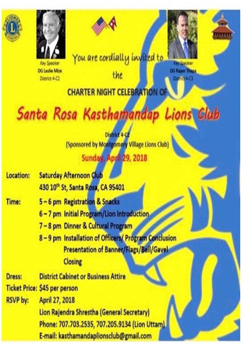 चार्टर नाइट कार्यक्रम 430 10th St, Santa Rosa, CA 95401 मा साँझ ५ शुरु हुनेछ र चार्टर नाइटका प्रमुख बक्ताहरुमा लायन्स क्लब डिस्ट्रिक 4-C2 का गभर्नर DG Leslie Mize र 4-C3 का गभर्न Rajen Thapa रहनु भएको आयोजकले जानकारी दिएका छन् ।