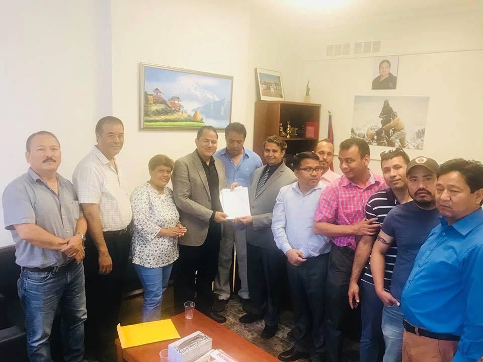 बुधवार समितिका केन्द्रीय सभापति एवं कांग्रेसका आमन्त्रित केन्द्रीय सदस्य आनन्द विष्ट र महासचिव मुनिन्द्र नेम्वाङ्गको नेतृत्वमा गएको समितिको प्रतिनिधि मण्डलले न्यूयोर्कस्थित महावाणिज्य दूतावासको कार्यालयका वाणिज्यदूत पुष्पकुमार भट्टराईलाई ज्ञापन पत्र हस्तान्तरण गरेको थियो ।