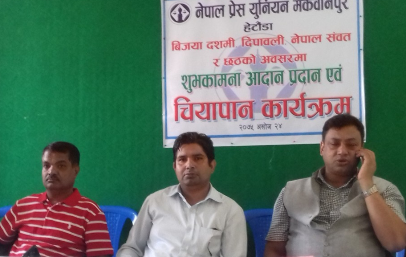 प्रेस युनियन मकवानपुरका अध्यक्ष कुमार अधिकारीको सभाध्यक्षतामा भएको कार्यक्रममा नेपाली कांग्रेस मकवानपुरका निवर्तमान सभापति रघुरमण न्यौपाने, नेपाल प्रेस युनियनका मध्यमाञ्चल संयोजक राममणि दाहाल, पार्टी जिल्ला सचिव बुद्ध लामा, कोषाध्यक्ष गोपीलाल विक, प्रवक्ता प्रदीप कोइराला, नगर सभापति आनन्दराम पराजुली, नेपाल पत्रकार महासंघका अध्यक्ष हरि हुमागाईं, प्रेस सेन्टरकी अध्यक्ष नानीमैया विष्टलगायतको आतिथ्यता रहेको थियो ।