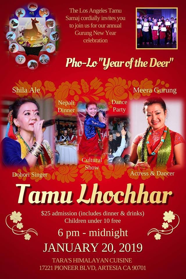 क्यालिफोर्निया लसएन्जल्समा गुरुङ्ग समुदायले आफ्नो सुन्दर कला र संस्कारलाई जगेर्ना गर्ने उध्येश्यले नयाँ बर्ष २०१९ जनवरी महिनाको २० तारिख आईतबारको दिन तारा हिमालयन कुजिन आर्टेशिया शहरमा ल्होछार पर्ब दोहाोरी गायिका शिला आलेमगर र गुरुङ समुदायकी चर्चित कलाकार मिना गुरुङको साथमा मनाउने भएको छ । तमु ल्होछारको सम्पुर्ण तयारी सम्पन्न भईसकेको छ ।
