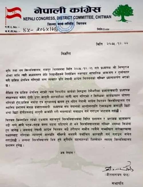कृषि तथा वन विज्ञान विश्वविद्यालय रामपुरका कृषि संकाय प्रशासनिक सहायक डीन प्राध्यापक विष्णुराज ओझामाथि भएको सांघातिक आक्रमण र कालोमोसो प्रकरणप्रति नेपाली काँग्रेस चितवनले ध्यानाकर्षण भएको जनाएको छ ।