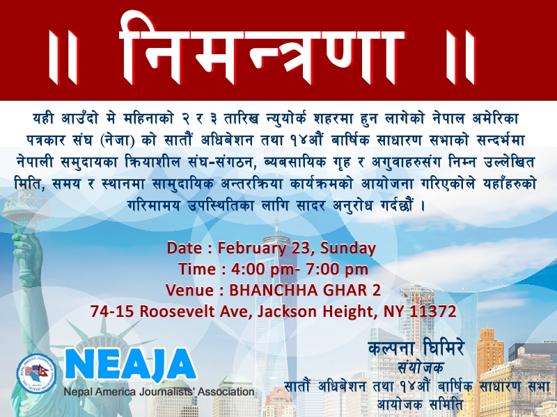 न्युयोर्क- नेपाल अमेरिका पत्रकार संघ (नेजा) ले फेबु्रअरी २३ आउँदो आइतवार न्यूयोर्कमा सामुदायिक भेला गर्ने भएको छ ।