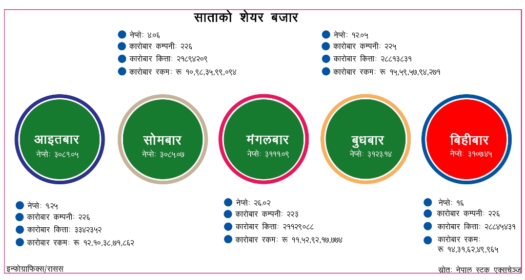 काठमाडौँ । विकास बैंकको शेयरमा लगानीकर्ताको आकर्षण देखिएपछि धितोपत्र बजारमा शेयर कारोबार मापक नेप्से परिसूचक आज दोहोरो अङ्कले बढेको छ । नेपाल स्टक एक्सचेञ्जका अनुसार कारोबार हुने साताको अन्तिम दिन आज नेप्से १६.४१ अङ्कले बढेर तीन हजार १७९ मा पुगेको छ । यस्तै ठूला कम्पनीको शेयर कारोबार मापन गर्ने सेन्सेटिभ परिसूचक ५.४६ बिन्दुले…