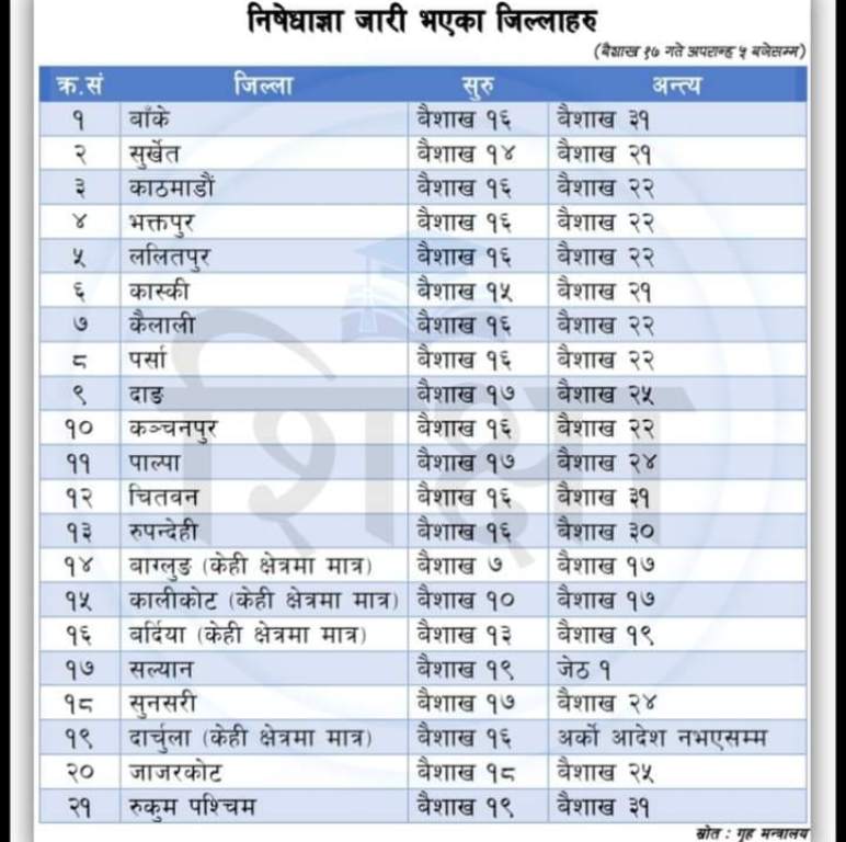 काठमाडौँ । सरकारले कोभिड–१९ को सङ्क्रमको अवस्था हेरेर निषेधको आदेश जारी गर्न सक्ने अधिकार प्रमुख जिल्ला अधिकारीलाई दिएसँगै विभिन्न जिल्लामा जारी गरिएको छ । गृह मन्त्रालयका अनुसार आजसम्मको प्राप्त विवरणमा कुल २३ जिल्लामा निषेधको आदेश जारी गरिएको छ । त्यसमध्ये आजसम्म १९ जिल्लामा आदेश कार्यान्वयनमा आएको छ । केही जिल्लामा आंशिक र…