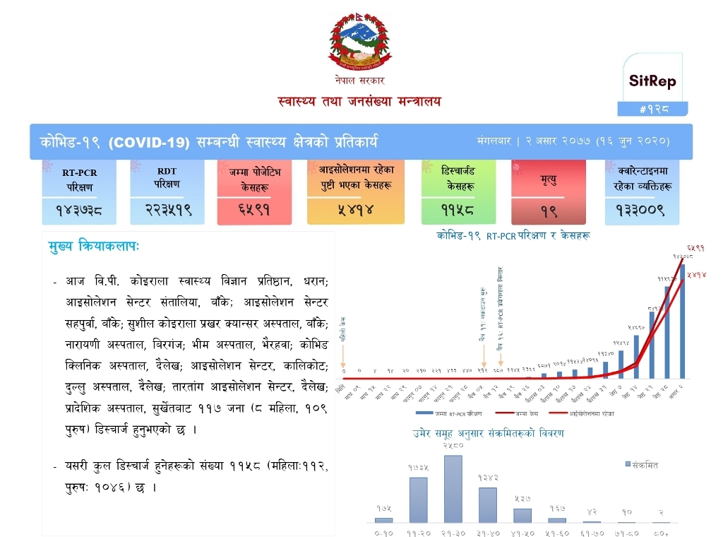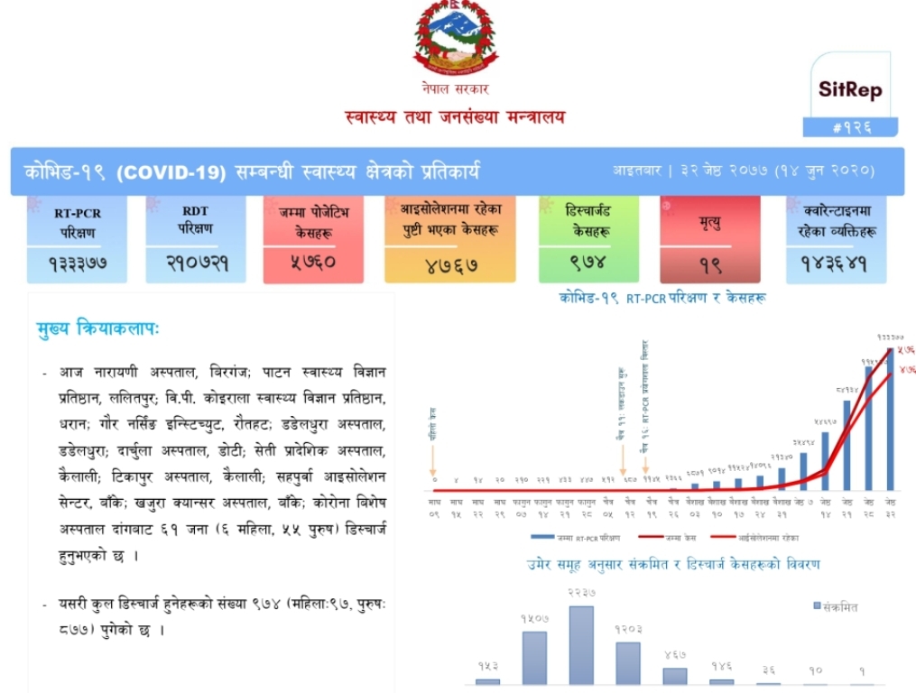 काठमाडौँ । नेपालमा बिहीबार थप ६७१ जनामा कोरोना संक्रमण पुष्टि भएको छ । स्वास्थ्य तथा जनसंख्या मन्त्रालयले अद्यावधिक गरेको विवरणअनुसार एकैदिन ६७१ जनामा संक्रमण पुष्टि भएको हो । जसमा ४० महिला र ५४६ पुरुष रहेका छन् । नेपालमा शुक्रबार ४४८, शनिबार २७३, आइतबार ४२५, सोमबार ५५१, मंगलबार ३८०र बुधबार ५८६ जनामा संक्रमण पुष्टि भएको…