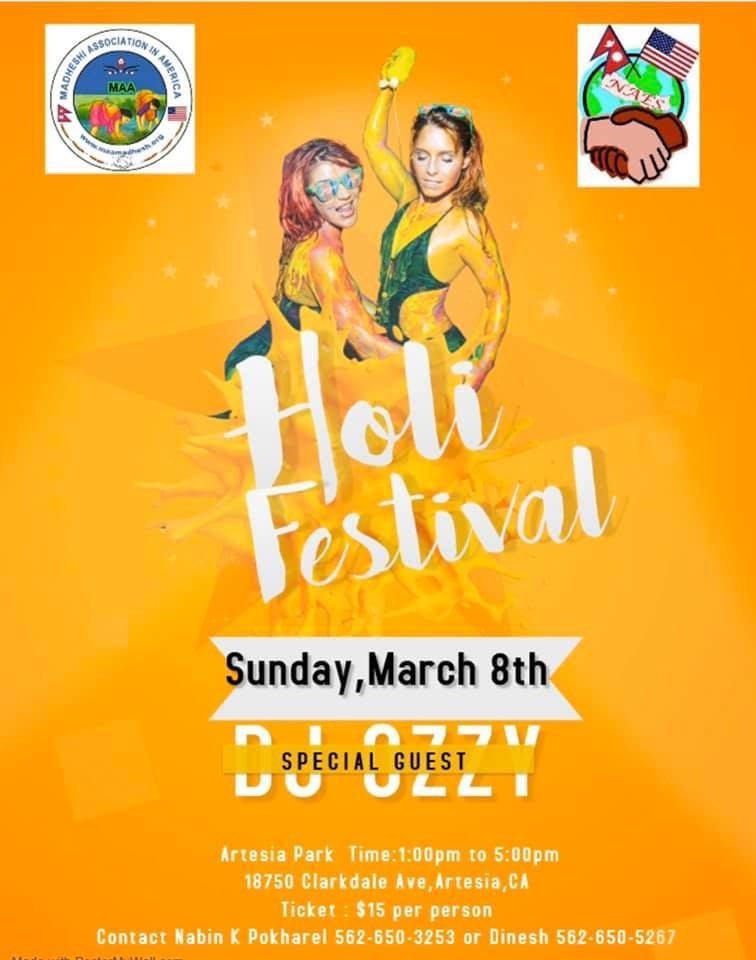 क्यालिफोर्निया(अमेरिका)- मधेसी एसोसिएसन इन अमेरिका, क्यालिफोर्निया च्याप्टर र नेपाल अमेरिका एकता समाजको संयुक्त आयोजनामा हिन्दूहरुको रंगहरुको पर्व होली यसपाली लसएन्जल्समा आगामी मार्च महिनाको ८ तारिख आईतबारका दिन आर्टेसिया पार्क 18750 Clarkdale Ave, artesia CA 90701 मा मनाईंदैछ । यो चाँड विशेष गरि हरेक बर्षको फागुण शुक्ल तथा फागु पुर्णिमाको दिन मनाईन्छ । यो नेपाल,…